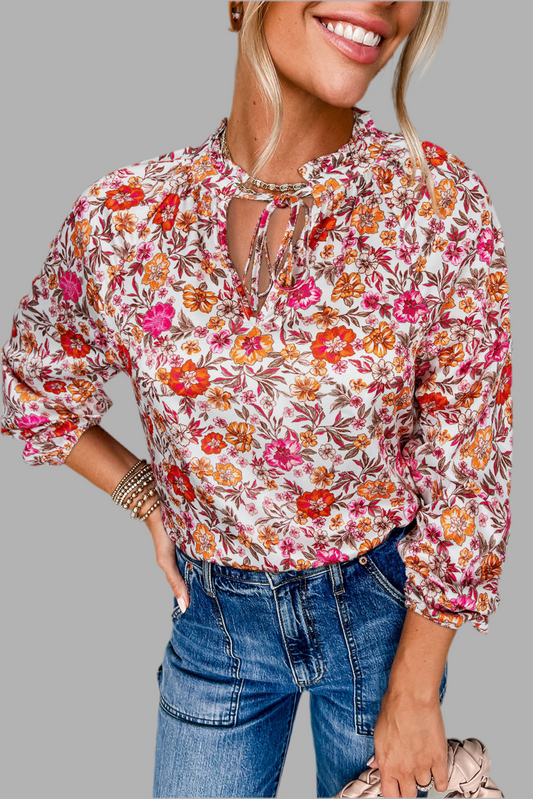 Pink Floral Print Tie Split Neck Bracelet Sleeve Blouse