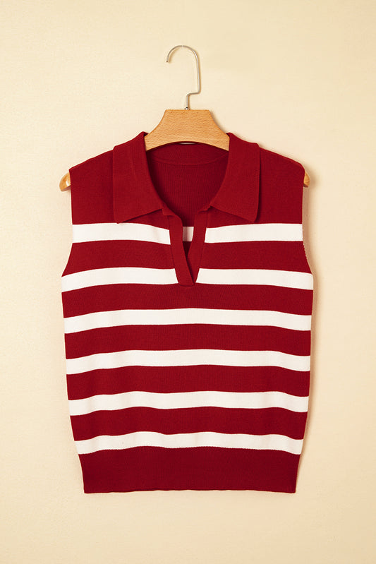 Red Stripe Buttoned V Neck Collared Drop Shoulder Top
