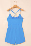 This spaghetti straps romper adds a feminine and trendy touch to your look. Define your waistline with a practical drawstring waist that allows you to adjust the fit. Opt for a classic and versatile solid color design that offers a timeless and sophisticated aesthetic. Showcase a unique and eye-catching crossed back detail that adds a playful and stylish twist.
