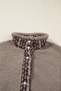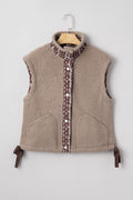 This sherpa vest with side bow details is a perfect layering piece. The fuzzy sherpa texture brings luxurious comfort! Contrast floral patched trim adds visual interest to this jacket vest. Button-up front allows convenient wearing.