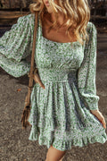 This floral mini dress is a charming piece that exudes femininity. The square neck and lantern sleeves offer a modern and elegant look. The shirred waist flatters the figure and adds a touch of sophistication. Ruffles adorn the mini dress, creating a romantic silhouette.