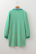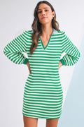 Chic striped pattern with a contrasting collar for a polished preppy vibe. Split neck design adds a modern and flirty touch. Long sleeves make it perfect for transitioning between seasons. Mini dress silhouette flatters the legs while keeping the look playful.