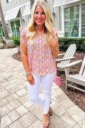 It has a ruffled notched v-neckline, ruffle cap sleeves and a relaxed fit