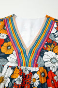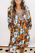 This is a perfect vacation dress for women. Features a vibrant floral pattern and striped lace detail. It has a contrast v neck, long puff sleeves, and pocketed design. The high waist mini dress is quite popular with a flowy skirt section.
