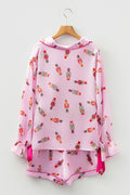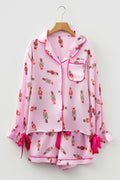 Silky 2-piece pajama set with nutcracker print for festive and stylish holiday sleepwear. Contrast trim and tied-up bow add a chic touch to this cute Christmas loungewear set. Made of soft silky fabric, perfect as a Christmas gift pajama set for ladies. Fashionable holiday print pajamas set ideal for lounging, sleeping, family photos etc.