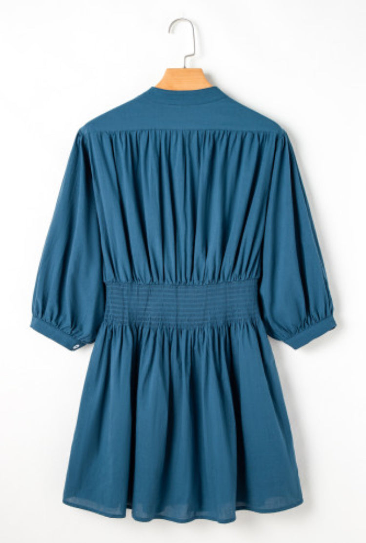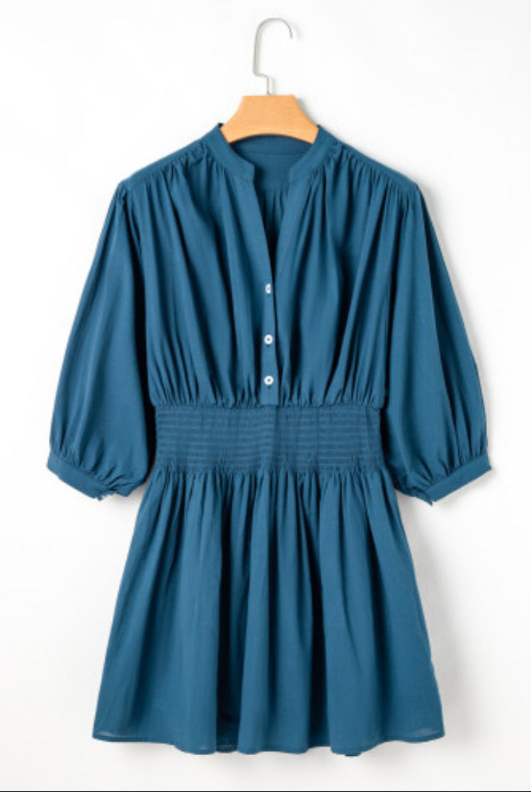 This buttoned dress elevates your style with a charming detail. Effortlessly chic with versatile 3/4 sleeves. Flatter your figure with a trendy shirred high waist. Stay classy with a sophisticated collared neckline.