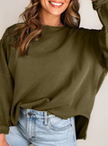 Unique horizontal ribbed knit design adds texture and visual interest. Trendy exposed seam details give a casual, laid-back vibe. Patchwork sleeves create a stylish contrast and modern look. Relaxed loose fit ensures all-day comfort and easy layering.