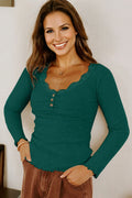 Skobeloff Lace Neckline Button Decor Lettuce Edge Long Sleeve Ribbed Top